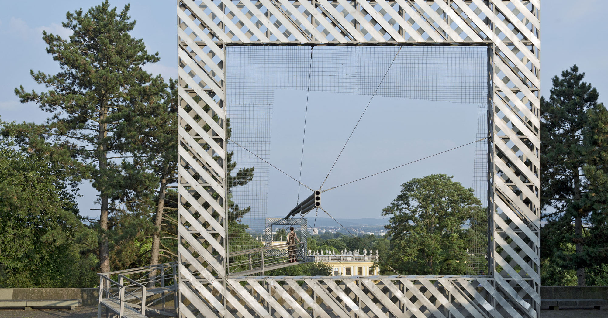 Der begehbare „Rahmenbau“ von Haus-Rucker-Co öffnet seit der documenta 6 im Jahr 1977 den Blick zum Staatspark Karlsaue und der Orangerie.